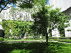 Most of the house, except for the gallery wing at the north end, is recessed 75 feet (23 m) behind a garden on Fifth Avenue.[25][26][27] This contrasted with similarly large mansions built in Manhattan during the early 20th century, which were generally built as close as possible to the boundaries of their lots.[26] Original plans called for a sunken garden facing Fifth Avenue, flanked by the house on two sides, with a pool in the center.[28][29] The William H. Jackson Company designed a wrought iron fence around the Fifth Avenue garden, while John Williams Inc. designed entrance gates in the same style.[30] When the house was completed, there was a stone wall with a balustrade along Fifth Avenue,[27] and the garden itself had evergreen trees.[31] There was a small formal garden at the south end of the Fifth Avenue garden, at the same level as the house's first floor.[32] Three magnolia trees were planted during a 1939 renovation;[33] by the late 20th century, the Fifth Avenue garden was cited as containing roses, violets, lantana, blue Egyptian lily, and white petunias.[34] The garden was rarely open to the public until the late 2000s.[35]