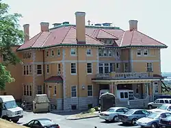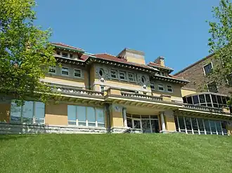 The 312-story house is composed of cream-colored brick in a combination of the Spanish revival and Mission revival styles. It sits high on the bluff on spacious, terraced grounds. The house remains largely intact even though the east side has been modified somewhat to connect to the main nursing home building.[13] There is a Porte-cochère on the north side of the house, and tall end chimneys with decorative concrete caps at several different locations. Other decorative elements on the houses exterior include Baroque ornamentation surrounding oval windows; a balustraded piazza; and superimposed loggia with columns distyle-in-antis. The entire structure is capped with multiple hipped roofs covered in red ceramic tiles.