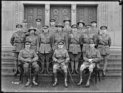 Group portrait of Major General Andrew Hamilton Russell (front row, centre), commanding the New Zealand Division, with staff officers at division headquarters in Leverkusen, Germany, March 1919. Present also is Lieutenant Colonel H. M. "Jumbo" Wilson, the division's GSO1, sat to Russell's right.