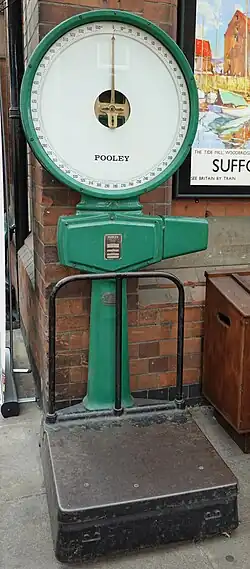 The company was absorbed into W & T Avery.[1] An example of the company's weighing machines can be found on Platform 2 of Ipswich railway station in Suffolk. There is also a luggage weighing scale made by Pooley on the railway station platform at Haverthwaite in Cumbria.