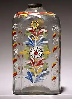 Stiegel advertised "enameled glass" for sale, and while he apparently did produce some actual enameled glass in his factory, it was long thought that this referred to the brightly colored style of "peasant glass" produced in Bohemia, Germany and Switzerland, some of which was imported to America. This type, whether made in Europe or America, is still often called "Stiegel-type" glass in America, even though it is now thought that Stiegel's advertisements actually meant white milk glass or the use of twisting white canes within stemware, not true enameled glass.[7] Etched clear glasses may also be called "Stiegel-type".