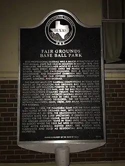 Two big-league ball clubs barnstormed through Houston in 1887, the New York Giants and the St. Louis Browns, and played at Herald Park. When the Browns played, they faced a team composed of five from the Chicago White Stockings, two from the Pittsburgh Alleghenys, and two from Cincinnati Red Stockings.[8] The Red Stockings as a whole returned to Houston the following season, but this time as the opponent of Houston's first fully professional ball club in their first ever game.[9]