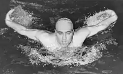 He also competed at the 1956 Summer Olympics in the 200 m breaststroke. This was the first Olympics after the breaststroke stroke was bifurcated in 1953[5] into two strokes-the contemporary underwater breaststroke with a frog kick and the butterfly stroke with the over the water arm motion using the dolphin kick. Unfortunately, he was disqualified after finishing first in the second heat for using an illegal scissors kick in the breaststroke.[6]