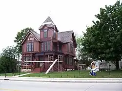 Crown Services from nearby Kiel, Wisconsin, painted the house. It had to start painting in 2007 because winter temperatures came early in 2006. It finished the job by the July 2007 opening. The company nominated the paint job for a national paint award by Zinsser Company, and it was awarded $10,000 and its "Top Job" winner for 2007.[13] The painters had to deal with lead paint, so worker had to have a lead abatement area to lessen lead poisoning.[13] A minimal amount of damaged siding and trim was replaced to maintain the historic nature of the house.[13] When paint was sprayed, it had to be back brushed to keep the hand-painted look.[13] Two coats of chocolate-colored latex paint were applied. The Timm house paint job was featured on the cover of American Painting Contractor's March 2008 issue.[13]
