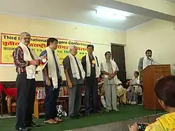 Ravindra Prabhat addressing the Third International Bloggers Conference in Kathmandu, 13 September 2013. With senior Nepali Congress leader Arjun Narasingha K.C., Kumud Adhikari, Vikram Mani Tripathi, KK Yadav and Rajiv Shankar Mishra.[7]