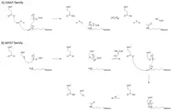 Studies of yeast Esa1 from the MYST family of HATs have revealed a ping-pong mechanism involving conserved glutamate and cysteine residues.[18] The first part of the reaction involves the formation of a covalent intermediate in which a cysteine residue becomes acetylated following nucleophilic attack of this residue on the carbonyl carbon of acetyl-CoA. Then, a glutamate residue acts as a general base to facilitate transfer of the acetyl group from the cysteine to the histone substrate in a manner analogous to the mechanism used by GNATs. When Esa1 is assembled in the piccolo NuA4 complex, it loses its dependence on the cysteine residue for catalysis, which suggests that the reaction may proceed via a ternary bi-bi mechanism when the enzyme is part of a physiologically relevant multiprotein complex.