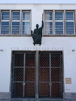 Figure of Pallas Athena and dedication "To the living spirit" above the entrance to the New University