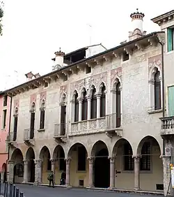 In the 13th century, Vicenza’s urban structure resembled that of other Veneto cities. At the heart of the oldest settlement—near the presumed site of the Roman Forum—stood the Palatium vetus, the commune’s first seat in the second half of the 12th century; the Salone dei Quattrocento, supported by arches under which the ancient cardo maximus passed and where the Council of Credenza met; and, further east, the Palazzo del Podestà, flanked to the north by the Torre dei Bissari and to the south by Torre del Tormento, representing the seat of public power. Surrounding these were market squares for retail trade: Piazza delle Biave (for fodder and seeds), Piazza del Vino,[58] Piazza delle Erbe, the Old and New Fish Markets,[59] Contrà Muscheria (for gloves and leather goods), and streets occupied by legal professions, such as the Nodari, and financial activities, like Contrà dei Giudei.[60]