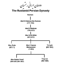 A Kharijite remnant established a state (776–909) under the Rustamids, whose capital was at Tahert (located in the mountains southwest of modern Algiers).[109] Apart from the lands surrounding Tahert, Rustamid territory consisted of largely the upland steppe or "pre-Sahara" that forms the frontier between the better watered coastal regions of the Maghrib and the arid Sahara desert. As such, its territory extended in a narrow climatic strip eastward as far as Tripolitania and Jebel Nefusa (in modern Libya). In between lay southern Ifriqiya, where Rustamid lands included the oases of the Djerid, with its chotts (salt lakes), and the island of Djerba.[110] The functionality of this elongated geography may be explained by the liberal nature of the Rustamid government: "[T]he imam did not so much rule or govern the surrounding tribes as preside over them, his authority being recognized rather than imposed and his mediation in disputes willingly sought."[111] As such this Rustamids territory ran from Tlemcen in the west to Jebel Nefusa in the east.
