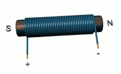 A simple electromagnet, consisting of an insulated wire wound around an iron core. An electric current passing through the wire creates a Magnetic field, with a north pole at one end and a south pole at the other