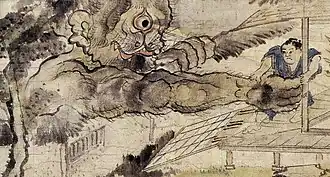 They can be seen in the legends and folklore of various places,[1] and like the mikoshi-nyūdō, there are some that expand and contract their height.[2] In Kyoto, it is said that their true identity is that of a fox (kitsune).[2] Also, a hitotsume-nyūdō appears in the kaidan Inō Mononoke Roku from the Edo period, and there was a picture depicting it attempting to capture the main character Heitarō (refer to image), but this one is a tanuki that has shapeshifted.[2]