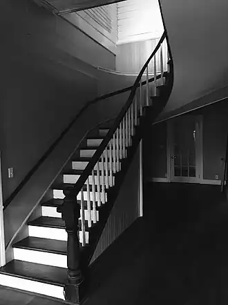The home also has a number of other distinctive features which were not noted in the National Register description. The pedimented Pediment gabled dormers mentioned feature detailed wood fretwork, typical of the early decades of the 19th century. This wooden ornamentation is also present on the double screen doors and are likely an early, if not original, feature of the house. The interior of the home features a wide central hallway which showcases a dramatic winding staircase. The rooms on the first floor feature 12 ft. ceilings and two centrally located chimneys allow for each of the four principal first floor rooms to have its own fireplace. These fireplaces, which were originally configured to burn wood were later modified to use coal, and later blocked off altogether for use of propane/gas heaters.