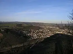 The great many barrows within Hochstetten-Dhaun's limits bear witness to settlers in the area even in prehistoric times. About 1100, Hochstetten/Hochstädten had its first documentary mention in a document from the Archbishopric of Mainz to Disibodenberg Abbey, which named a Ludovicus de Hosteden (“Ludwig/Louis of Hochstetten”), who donated holdings to the Abbey that he owned in Merxheim. The name prefix Hoch— seen in both “Hochstetten” and “Hochstädten” has nothing to do with those constituent communities’ geographical locations (hoch means “high” in German) for both Hochstetten and Hochstädten lie on rather low land down near the River Nahe. Far likelier is that the name is a corruption of what would be rendered Hofstätte in modern German, something with a perfectly transparent meaning, namely “estate place”. Clearly, this would describe a place where a landowner once held an estate. Nowadays, the two names Hochstetten and Hochstädten are pronounced alike, meaning that a distinction must be made in speech between them (to say nothing of Hochstätten, a self-administering municipality some 23 km to the east, also in the Bad Kreuznach district, and also with a name pronounced the same way). They did, however, once have official names that allowed easy distinction between the two. Hochstetten on the Nahe's left bank was known as Nächsthochstetten, whereas Hochstädten over on the right bank was known as Überhochstetten. These usages lasted centuries, and referred to the two centres’ positions relative to Castle Dhaun. Nächsthochstetten lay nearer the castle (its prefix means “next” or “nearest”), while Überhochstetten lay beyond it, across the river (its prefix means “across”, “over” or perhaps even “the one after the next”). Both villages were part of the Waldgravial-Rhinegravial Amt of Dhaun and formed the court district (Gericht) or Schultheißerei of Hochstetten. After the so-called “Dhaun Feud” (Dhauner Fehde) between Waldgrave Johann von Dhaun and Prince-Archbishop-Elector Baldwin of Trier had ended in defeat for the former, he had to cede his village in 1342 to the Electorate of Trier, whereupon Baldwin then enfeoffed the Waldgraves with the very holding that they had just forsaken, thus ensuring the Waldgraves’ allegiance to their former foe.[6] The Counts of Veldenz, too, had certain landholds and rights that they had granted to vassals. In 1426, the Vogt Johann von Simmern held a half share in the village and court at Überhochstetten (Hochstädten) as a fief from the Waldgraves of Dhaun. In 1515, the Waldgravial Amt of Dhaun was made up of the castle, the village and the Vogtei of Simmern unter Dhaun, the villages of Nächsthochstetten and Überhochstetten and the Dhaun shares of Kirn, Bergen, Rhaunen and Hausen. In 1794, during the War of the First Coalition, French Revolutionary troops overran and occupied the German lands on the Rhine’s left bank, whereafter, in 1798, the region was administratively reorganized by the Directory according to the French Revolutionary model. The Nahe formed the boundary between two departments. The villages of Nächsthochstetten (Hochstetten) and Dhaun were grouped into the Mairie (“Mayoralty”) of Kirn, the Canton of Kirn, the Arrondissement of Simmern and the Department of Rhin-et-Moselle, whereas Überhochstetten – whose name was at this time changed to Hochstädten – belonged to the Mairie of Merxheim, the Canton of Meisenheim, the Arrondissement of Birkenfeld and the Department of Sarre. The Protestant parish of St. Johannisberg lost its autonomy and was made subject to the parish of Meckenbach. Once French rule had ended in the Rhineland in 1814, the Congress of Vienna awarded the region to the Kingdom of Prussia, which took possession of it in April 1815. The municipalities of Hochstetten and Dhaun passed in 1816 to the Bürgermeisterei (“Mayoralty”) of Kirn (later named the Amt of Kirn-Land in 1927) in the Kreuznach district in the Regierungsbezirk of Koblenz. The area south of the Nahe was ceded in 1816 to the Landgraves of Hesse-Homburg. Hochstädten became part of the Oberamt of Meisenheim, which existed until 1866, then being absorbed into the Prussian Meisenheim district. Hochstädten belonged to the Bürgermeisterei of Meddersheim (later named the Amt of Meddersheim in 1927). The Meisenheim district was merged into the Kreuznach district in 1932, thus ending the division of the three municipalities of Dhaun, Hochstädten and Hochstetten into different districts. After the Amt of Meddersheim was dissolved in 1940, Hochstädten likewise passed to the Amt of Kirn-Land, out of which today's Verbandsgemeinde of Kirn-Land was formed in 1968. Today's Ortsgemeinde of Hochstetten-Dhaun arose within the framework of municipal restructuring and administrative reform through a voluntary merger of the hitherto three self-administering municipalities of Dhaun (then with 208 inhabitants), Hochstädten (322) and Hochstetten bei Kirn (835) on 7 June 1969.[7][8]