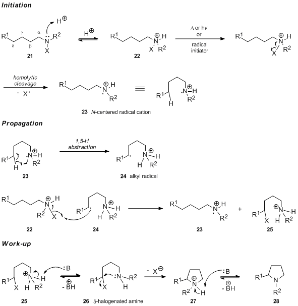 - The initially formed nitrogen-centered radical abstracts a H-atom mostly from the δ-position and thus 5-membered rings are formed predominantly.