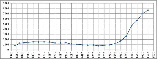 The table to the right and nearby chart, taken primarily from historical data from the U.S. Census Bureau,[16] shows the population of Hollis from 1767 through 2010.[17] [18] [19] [20] [21] [22] [23] [24] [25] [26] [27] [28] [29] [30] [31] [32] [33] [34]