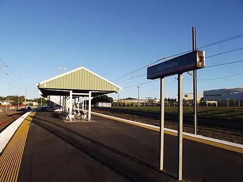 Holmview station opened in 1885 as Holme View.[2] It was named Holme View because it had a view of the Loganholme area.[3] The station was renamed Holmview shortly afterwards. On 21 April 1992, a second platform opened as part of the duplication of the line.[4]