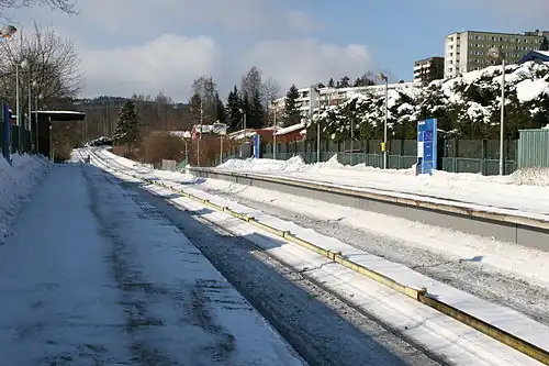 In 1990, it was decided to upgrade the Sognsvann Line to metro standard, which involves a heightening and lengthening of the platforms, installation of third rail power supply and a new signaling system.[4] Many residents feared that Holstein station would be closed together with Frøen,[5][6] but only the latter was closed.[7] The upgrade started three years later, when Tåsen station was moved 150 metres (490 ft) further north,[8] and Nordberg Station was closed.[9] Holstein was closed for traffic during the construction period.[4] Underpasses were built at both Holstein and Nordberg stations,[10] and new ticket machines were installed at Holstein.[11]