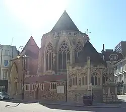 Holy Trinity Church is an Anglican church in the centre of Hastings, a town and borough in the English county of East Sussex. It was built during the 1850s—a period when Hastings was growing rapidly as a seaside resort—by prolific and eccentric architect Samuel Sanders Teulon, who was "chief among the rogue architects of the mid-Victorian Gothic Revival".[1] The Decorated/Early English-style church is distinguished by its opulently decorated interior and its layout on a difficult town-centre site, chosen after another location was found to be unsuitable. The church took eight years to build, and a planned tower was never added. English Heritage has listed the building at Grade II* for its architectural and historical importance.