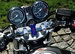 Instrumentation consists of an analog speedometer and tachometer and basic indicator lamps, incorporated under a tinted window, and a single tripmeter.[22] While it normally was equipped with a centerstand, California models did not have room for one due to additional emissions control equipment.[22]