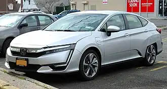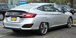 The Honda Clarity is a nameplate used by Honda on alternative fuel vehicles. It was initially used only on hydrogen fuel-cell electric vehicles such as the 2008 Honda FCX Clarity, but in 2017 the nameplate was expanded to include the battery-electric Honda Clarity Electric and the plug-in hybrid electric Honda Clarity Plug-in Hybrid, in addition to the next generation Honda Clarity Fuel Cell. Clarity production ended in August 2021 with US leases for the fuel cell variant continuing through to 2022.[2] As of 2025, the Honda Clarity (2016-2021) is the last known production car to feature fixed rear Wheel Skirts. [3]