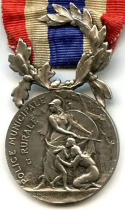 The Honour medal of the National Police, a design of engraver Marie Alexander Coudray, is a 27mm in diameter circular silver medal. The obverse bears the relief image of the protecting Republic, in the form of a standing helmeted woman holding a sword and a shield, protecting a kneeling woman pulling a frightened child to her, behind them a tree. Along the right circumference, the semi circular relief inscription "POLICE FRANÇAISE" (English: "FRENCH POLICE").[1]
