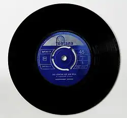 45-RPM single of Jag väntar vid min mila purchased in Denmark around 1964–1965. Built-in center adapter is still attached.