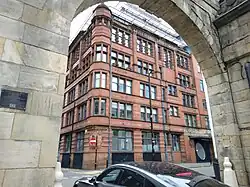 Former warehouse of the company visible through the Piccadilly Basin entry arch, Manchester city centre