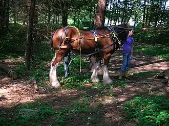 Horses can efficiently extract a single damaged tree from a forest without roadbuilding required for powered vehicles.[4] The technique can be more efficient than using power equipment, considering the cost of transportation and fuel, especially on smaller privately held forest parcels.[5][6]