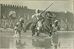 The horse constitutes a cultural heritage, particularly in the Darfur region, among the Missairiyah and the Rizeigat tribes.[4] It appears that horse racing has been practiced in Darfur since 16th century.[5] During the 20th century, a policy of improving breeding was put in place[6] with the support of local tribes, who participated in the establishment of Thoroughbreds, particularly in the Khartoum region.[4] The English imported horse racing in 1929, and built a racecourse in Khartoum, at the confluence of the Blue Nile and the White Nile.[2] They imported other equestrian practices then unknown to the Sudanese, such as polo and tent pegging. While they had no intention of teaching equestrian sport to the Sudanese, this practice survived the colonial period, equestrian sport being in full development during the country's independence in 1956.[2] According to Ahmed Mekki Abdu, first Governor of Khartoum after independence, the English re-sold their horses to the Sudanese before their departure, allowing the maintenance of large stables sometimes numbering dozens of horses.[2]