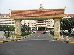 Construction of the Cambodiana was initiated by Prince Norodom Sihanouk in the early 1960s. He originally requested a 10-bungalow luxury resort/government guesthouse, but noted Cambodian architect Lu Ban Hap suggested a larger international luxury hotel would be more profitable.[2] Lu designed the structure in the then-popular New Khmer style. Construction of the Cambodiana began in 1963, on stilts on reclaimed land. The hotel opened in 1969, with 100 rooms, but only operated for a year. In 1970, Lon Nol's troops overthrew Prince Sianhouk and converted the hotel to military barracks.[3] The hotel was abandoned during the Khmer Rouge period, later serving as refugee housing.