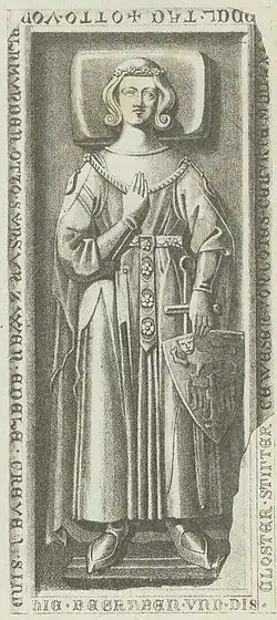 The Saxon annalist referred to Esico, Adalbert II, and Otto the Rich as "Counts of Ballenstedt," but this title is historically verified only for Otto (Ottoni comiti de Ballenstide) in 1106.[12] Thus, it is confirmed that he named himself after Ballenstedt Castle in the eastern Harz. Otto was briefly Duke of Saxony in 1112. He married Eilika, daughter of Duke Magnus of Saxony. Through this, he acquired Billung allodial estates and later received the Duchy of Saxony from the emperor. The count died in 1123 and was buried in Ballenstedt. His widow Eilika lived in Halle and Bernburg after his death. Otto the Rich and his son Albert the Bear converted the Ballenstedt collegiate church into a Benedictine monastery in 1123. His brother Siegfried was Count of Weimar-Orlamünde and Palatine of the Rhine.