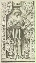 Albert the Bear was the first significant family member and the most prominent Askanier in the Middle Ages. A contemporary and rival of Henry the Lion (Welfs) and Conrad the Great (Wettins), he significantly advanced the German settlement of Slavic border marks and founded the Margraviate of Brandenburg on the territory of the former Nordmark. He briefly served as Duke of Saxony before becoming Margrave of Brandenburg, establishing his family's power in the Saxon eastern marches. His extensive territorial possessions were divided among his sons Otto, Herman, Bernhard, and Adalbert. This created the four main Askanier branches at the time: Brandenburg (until 1320), Weimar-Orlamünde (until 1486), Saxe-Wittenberg (until 1422), Saxe-Lauenburg (until 1689), and Anhalt (to the present). Albert is referred to as a Count of Aschersleben, indicating that the title "Counts of Aschersleben" emerged in the 12th century. He was first documented as comes Asscherslovensis on August 8, 1147, during a court session he presided over.[13] Whether Albert used this title himself is unclear, but he referred to himself as Margrave of Brandenburg in a document dated October 3, 1157 ("Adelbertus dei gratia marchio in Brandenborch").[14] The epithet "the Bear" was used in contemporary sources.[15] Albert the Bear died in November 1170 and was almost certainly buried in the Ballenstedt house monastery. The bear is the heraldic animal of Anhalt.[16] His son Bernhard used various Latin variants of Count of Aschersleben and later Duke of Saxony. The Gelnhausen Charter of 1180 included the division of the Stem Duchy of Saxony. In this arrangement, Bernhard was enfeoffed with the eastern part, which continued to bear the name Saxony. He received the ducal title the following year after the Erfurt Reichstag.