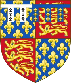 Quarterly, 1st and 4th, France ancien, 2nd and 3rd England, with a label of five points ermine (Richmond)[9] As Duke of Lancaster and Hereford: Quarterly, 1st and 4th, France ancien, 2nd and 3rd England, with a label of five points two of ermine (Richmond) and three Azure flory Or (Lancaster)[9] |