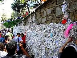 Outside the shrine is a particular "wishing wall" which pilgrims have used by tying their personal intentions on paper or fabric. Various types of florals and fruits are grown nearby, and additional lighting has been installed within the vicinity of the shrine for further monitoring of the site. A water fountain or well is also located nearby, believed by some pilgrims to have miraculous powers of healing or fertility.