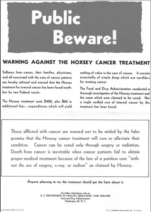 - ^ a b c d Cantor D (2006). "Cancer, quackery and the vernacular meanings of hope in 1950s America". J Hist Med Allied Sci. 61 (3): 324–68. doi:10.1093/jhmas/jrj048. PMID 16565262.