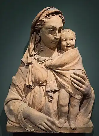 The Huldschinsky Madonna is a terracotta sculpture from the beginning of the 15th century, most probably from around 1410–1415.[1][2][3] It is attributed to Donatello, an attribution based on the structure of the drapery, which is no longer simply a means of expression and decoration as in Gothic art but is instead more naturalistic and observed from life, following a strict dialogue with the anatomical forms beneath it and obeying the rules of gravity. The work's attention to detail such as the fringes on the clothing also recalls the artist's other works such as the marble David. The sculpture was formerly painted. It has been in the Bode Museum in Berlin (the Kaiser Friedrich Museum at the time of the work's accession) since being donated by Oscar Huldschinsky in 1892 in Florence, who himself never owned it.[1]