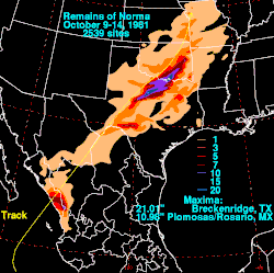 Hurricane Norma was one of the two hurricanes to make landfall during the 1981 Pacific hurricane season. It developed on October 8, strengthening into a tropical storm and later a hurricane. Norma moved slowly to the northwest and strengthened into a Category 3 hurricane on the Saffir–Simpson hurricane scale. The storm recurved and accelerated to the northeast on October 11 and weakened to a Category 2. The next day, Norma made landfall near Mazatlán on October 12 and soon dissipated. The hurricane's remnants continued northeastward and entered the United States, crossing into central Texas before being absorbed by a frontal system on October 14. Norma caused $24 million in crop damage and one death in Mexico, as well as up to 10 in (250 mm). In Texas, the storm produced flooding rains that killed five people, caused $50 million in damage and caused many tornadoes. Rainfall was also reported as far inland as Kansas.