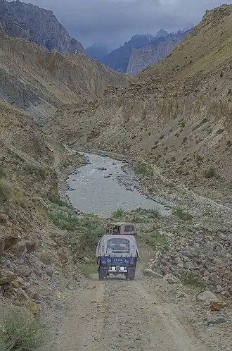 The Hushe River[2] is a tributary river to the Shyok River which itself is a tributary to the Indus River. The main source of the Hushe River is the Gondogoro Glacier. Some streams also flow from other glaciers of the Hushe valley. The Hushe river joins with Saltoro River at Haldi village before joining the Shyok River. Both the Hushe and Saltoro rivers join the Shyok river at the Tsa thang Ghursay village.