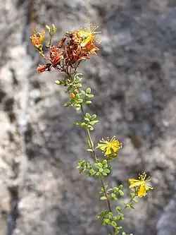 Hypericum humboldtianum grows 10–75 cm (3.9–29.5 in) tall, with pseudo-dichotomous, divergent or lateral branches. The orange to brown four-lined stems are ancipitous when young and become terete, with their cortex exfoliating in strips. The internodes are 2.5–14 mm (0.098–0.551 in). The sessile or shortly pseudopetiolate leaves are spreading and deciduous, with pseudopetioles 0.5 mm (0.020 in) long. The oblong or oblanceolate leaves are 6–13 mm (0.24–0.51 in) long and 1.2–3 mm (0.047–0.118 in) wide, and are planar or incurved with a prominent midrib. The glaucous and coriaceous leaves have an acute to obtuse apex, a narrow base, and a sheathing pseudopetiole. Leaves have a single basal vein with or without lateral branches, and lack tertiary reticulation. The laminar glands are dense. The inflorescence is one to twelve flowered, branching dichasially or pseudo-dichotomously, with peduncles and pedicels 3–4 mm (0.12–0.16 in) long. The star-shaped flowers are 15 mm (0.59 in) wide. The elliptic to oblanceolate sepals are 14.6–16.5 mm (0.57–0.65 in) long and 1.3–2.2 mm (0.051–0.087 in) wide, with three to five veins and a midrib not prominent. The glands of the sepals are linear below, becoming punctiform in the upper third to upper half. The bright yellow, obovate petals are 6–8 mm (0.24–0.31 in) long and 3–5.5 mm (0.12–0.22 in) wide, with linear glands becoming punctiform distally. The thirty to fifty stamens are 5.5 mm (0.22 in) long at the most. The ovoid to cylindric ovary is 1.5–2 mm (0.059–0.079 in) long and 1 mm (0.039 in) wide. The three styles are about 2–3 mm (0.079–0.118 in) long. The stigmas are capitate. The cylindric-ellipsoid capsule is 4–6.5 mm (0.16–0.26 in) long and 2–3 mm (0.079–0.118 in) wide, equalling the sepals. The seeds are 0.5–0.6 mm (0.020–0.024 in) long and lack carinas.[2]