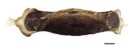 The larval case is dark brown, smooth, 9 millimetres (0.35 in) in length and 2 millimetres (0.079 in) wide. Adults were reared from case-making larvae collected on bark of a damp dead tree covered partially with lichen.