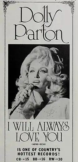 "I Will Always Love You" was issued on March 18, 1974, as the second single from Parton's thirteenth solo studio album, Jolene (1974). During its original release in 1974, "I Will Always Love You" reached number four in Canada on the Canadian RPM Country Tracks chart and peaked at number one on the Billboard Hot Country Songs chart, becoming one of the best selling singles of 1974.[27]