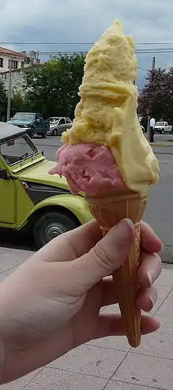 Ice cream in its modern form, or pagotó (Greek: παγωτό), was introduced in Greece along its development in Europe in the beginning of the 20th century. Earlier than that, ice treats have been enjoyed in the country since ancient times. During the 5th century BC, ancient Greeks ate snow mixed with honey and fruit in the markets of Athens. The father of modern medicine, Hippocrates, encouraged his Ancient Greek patients to eat ice "as it livens the lifejuices and increases the well-being."[15] In the 4th century BC, it was well known that a favorite treat of Alexander the Great was snow ice mixed with honey and nectar.[16] In the modern day, Greek ice cream has been heavily influenced by Turkish ice cream Dondurma; thus the name used to be called Dudurmas but, because of Greco-Turkish relations most Turkish related foods are coined a more Greek idiom. Greek ice cream recipes have some unique flavors such as Pagoto Kaimaki (Greek: Παγωτό Καϊμάκι), made from mastic resin which gives it an almost chewy texture, and Salepi, used as a thickening agent to increase resistance to melting, both giving a unique taste to the ice cream; Pagoto Elaeolado me syko (Greek: Ελαιόλαδο με σύκο), made of olive oil and figs; Pagoto Kataifi cocoa (Greek: Παγωτό Καταΐφι κακάο), made from the shredded filo dough pastry that resembles angel's hair pasta, similar to vermicelli but much thinner; and Pagoto Mavrodaphne (Greek: Μαυροδάφνη Παγωτό), made from a Greek dessert wine. Fruity Greek Sweets of the Spoon are usually served as toppings with Greek-inspired ice cream flavors.