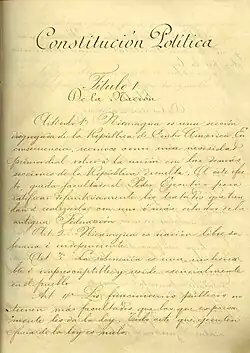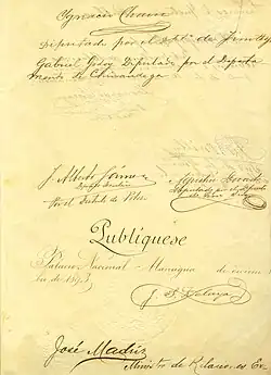 Ignacio Chaves Tellería was the President of Nicaragua from 1 January to 1 March 1891.[1] He was born c. 1836 in León, León, Nicaragua and died October 31, 1925, in León, León, Nicaragua. His parents were Eusebio Chaves and Ramona Tellería. He was married to Paulina López and their children were Ignacio, Tránsito, Dagoberto and Eusebio, all Chaves López. His first last name is Chaves, with S, and not Chávez, with accent and Z. Part of the confusion is that some of his children decided to write their last name as Chávez. In addition, people believed his second last name was López. That confusion arose from the fact that his son, Ignacio, wrote his name as Ignacio Chávez López. His registration certificate shows the correct names.[2]