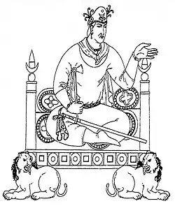 The Hunnic legacy appears in the coinage of Shishpir, as he adopted the Hunnic Y-shaped tamgha () on the reverse of his coins.[3] The symbol of the Hephthalites thus appears on the residual coinage of Samarkand, probably as a consequence of the Hephthalite control of Sogdia, and becomes prominent in Sogdian coinage until the Muslim conquest of Transoxiana.[4]