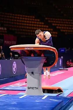 Kovtun competed at the World Cups in Cairo, Cottbus, and Baku; he won gold on the parallel bars at each competition.[33][34][35] He next competed at the Osijek Challenge Cup where he won gold on floor exercise and silver on parallel bars behind Lukas Dauser.[36] In late April Kovtun competed at the European Championships alongside Nazar Chepurnyi, Igor Radivilov, Radomyr Stelmakh, and Oleg Verniaiev; together they qualified to the team final in first place and individually Kovtun qualified to the parallel bars and horizontal bars finals. Additionally Kovtun finished sixth in the all-around. During event finals Kovtun won gold on both apparatuses.[37] During the team final Kovtun contributed scores on pommel horse, rings, parallel bars, and horizontal bar towards Ukraine's first place finish.[38]