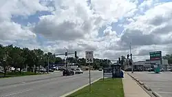 IL 56 travels along Butterfield Road in an east-northeast direction beyond IL 25, paralleling I-88. Butterfield Road serves as a major arterial road within the Illinois Technology and Research Corridor. Between the Batavia Spur of the Illinois Prairie Path and the Elgin, Joliet and Eastern Railway overpass, IL 56 serves as the southern border for Fermilab. Beyond the EJ&E Railway overpass, the road becomes a divided highway. IL 56 then parallels the Aurora branch of the Illinois Prairie Path between IL 59 and St. James Farm. IL 56 goes through commercial and industrial developments beyond I-355 in Downers Grove, such as Yorktown Center in Lombard. In Oak Brook, IL 56 exits off the mainline to continue along Butterfield Road; traffic continuing straight would end up on 22nd Street. IL 56 then meets IL 83 and IL 38 at a series of interchanges north of the Oakbrook Center. The surrounding commercial development wanes as IL 56 goes through residential areas in Elmhurst, Hillside, and Bellwood. In Bellwood, IL 56 leaves Butterfield Road and briefly travels east along Washington Boulevard before ending at US 12/US 20/US 45 (Mannheim Road).[2]
