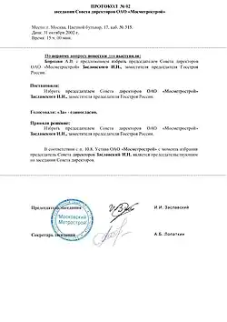Certificate of appointment for Ilya Zaslavskiy as chairman of the managing board (Совет директоров) of Mosmetrostroy