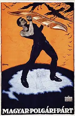 In 1921, due to political unrest in Hungary, he moved to Romania. There, in Timișoara, he was offered a leading position at Helikon Typography and spent some time as their artistic director. He maintained contacts with Budapest, however, and his posters continued to appear there. He later moved to Oradea, where he took a position with Typografie Sonnenfeld, designing book covers. He also produced illustrations for the local newspaper. In 1927, he and the painter Béla Zsigmond (?-1945) opened an art school. Two years later, he became Romania's representative to "The International Poster" exhibition in Munich.[3]