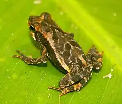 The native habitats of this species are wet lowland rainforests and the lower premontane wet forests at elevations to about 1,080 m (3,540 ft) asl.[1] Its favourite locations are near large streams and at the edges of forests.[12] In the northeastern rainforests of Costa Rica it occurs from sea level to 2,000 m (6,600 ft) in elevation, with frogs of the genus Eleutherodactylus being the few amphibians to occur at higher altitudes here.[6] It is occasionally found amongst the leaf litter on the forest floor.[12]
