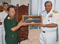 In 1992, India and Vietnam established extensive economic ties, including oil exploration, agriculture and manufacturing.[3] The relations between the two countries, especially defence ties, benefited extensively from India's Look East policy.[4] Bilateral military cooperation includes sale of military equipment, sharing of intelligence, joint naval exercises and training in counterinsurgency and jungle warfare.[5] India also regularly deploys its warships for goodwill visits to Vietnamese seas.